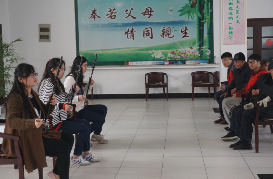 此次活动志愿者们表现积极,更有艺术团的同学们踊跃参加,为老人表演节目。中午一点半,阳光明媚,志愿者和艺术团的同学们整装待发,半小时车程后,大家到达了敬老院。老人们正在大厅聊天,说明来意后,艺术团的同学开始为老人表演。首先是二胡合奏,清新绵薄,欲断又连,结束后,爷爷奶奶们掌声连连;接下来是笛子独奏,舒缓灵动,沁人心脾;还有三人合唱红歌《在太行山上》、还有男声独唱《月亮代表我的心》,爷爷奶奶们都说这些孩子唱的真好。台上几分钟的精彩表演是他们认真排练的结果,可见他们对此次志愿活动的关注和用心。