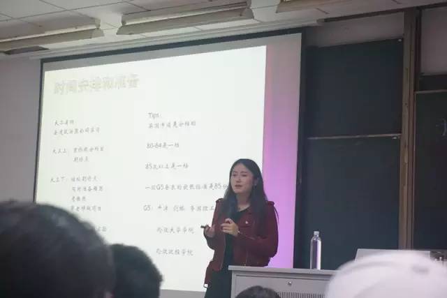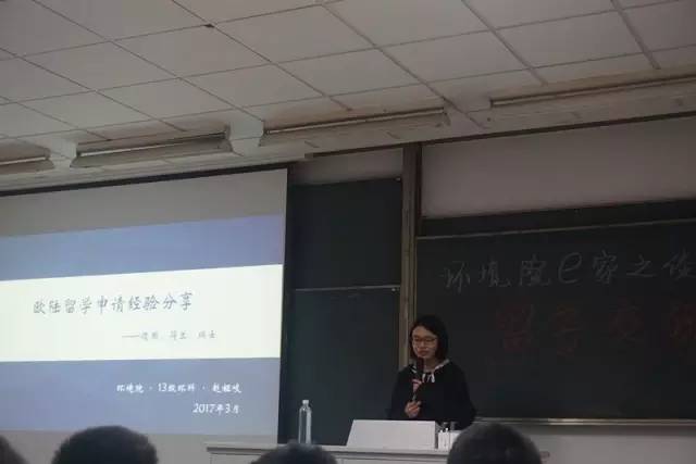 然后是来自13级环境科学中外合作专业的李铮同学为大家分享自己在留学方面的经验,李铮同学现已被英国帝国理工大学录取。李铮同学分享了自己留学准备的时间安排,并建议同学们尽早为出国留学做准备,在大三就可以着手向目标8x8x 递交申请,同时注意提高成绩以达到目标8x8x 的要求。李铮同学还就自己的面试经历提醒大家增加自己的实习工作经验,要注意对自己的大学及未来做好及时的规划。