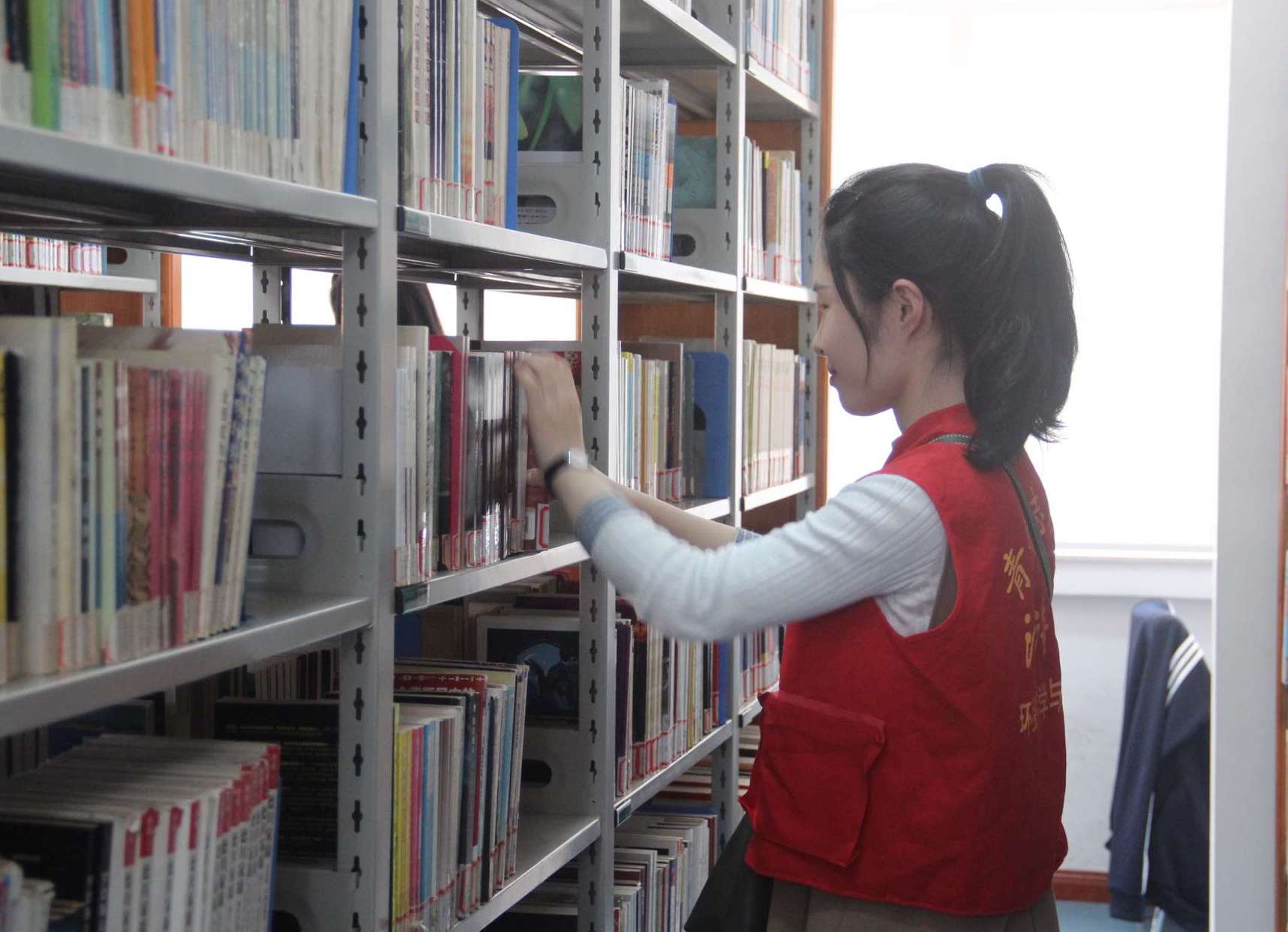 下午1:10,志愿者们准时从校门口出发来到江宁图书馆。大家穿好红色的青协制服,分配好任务,分为两组分别整理一楼儿童借阅处和二楼成人借阅处的书籍。任务分配完毕,志愿者立刻投入工作。每个人都手抱三四本书籍穿梭在书架之间,对图书的编号进行查找核实,快速有效的将书籍放归正确的位置,同时将放错位置的书本挑出并正位。志愿者们不停的走动、蹲下、站起,放回并细心的检查书籍。在两个小时的服务时间里,志愿者们和其它高校的同学们相互配合,一刻都不松懈,力争利用好每一分钟,尽量多的分担图书馆工作人员的工作。