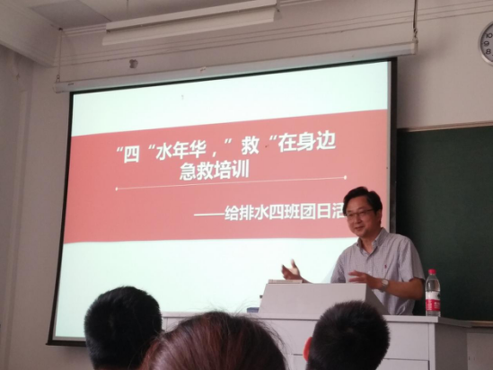 为更好的培育和践行社会主义核心价值观,同时积极响应2017年江苏省卫生计生委重点工作目标要求,提升大学生应急素养和急救互救能力,培养出更多具备较高综合素质的青年志愿者,2014级给排水四班团支部于2017年6月2日开展了以“四”水年华,“救”在身边为主题的团日活动。为此,特地邀请了8x8x 校医院副院长马红兵前来详细讲解各项急救知识,同时还邀请前8x8x 红十字会成员陈立豪进行实际操作演练。