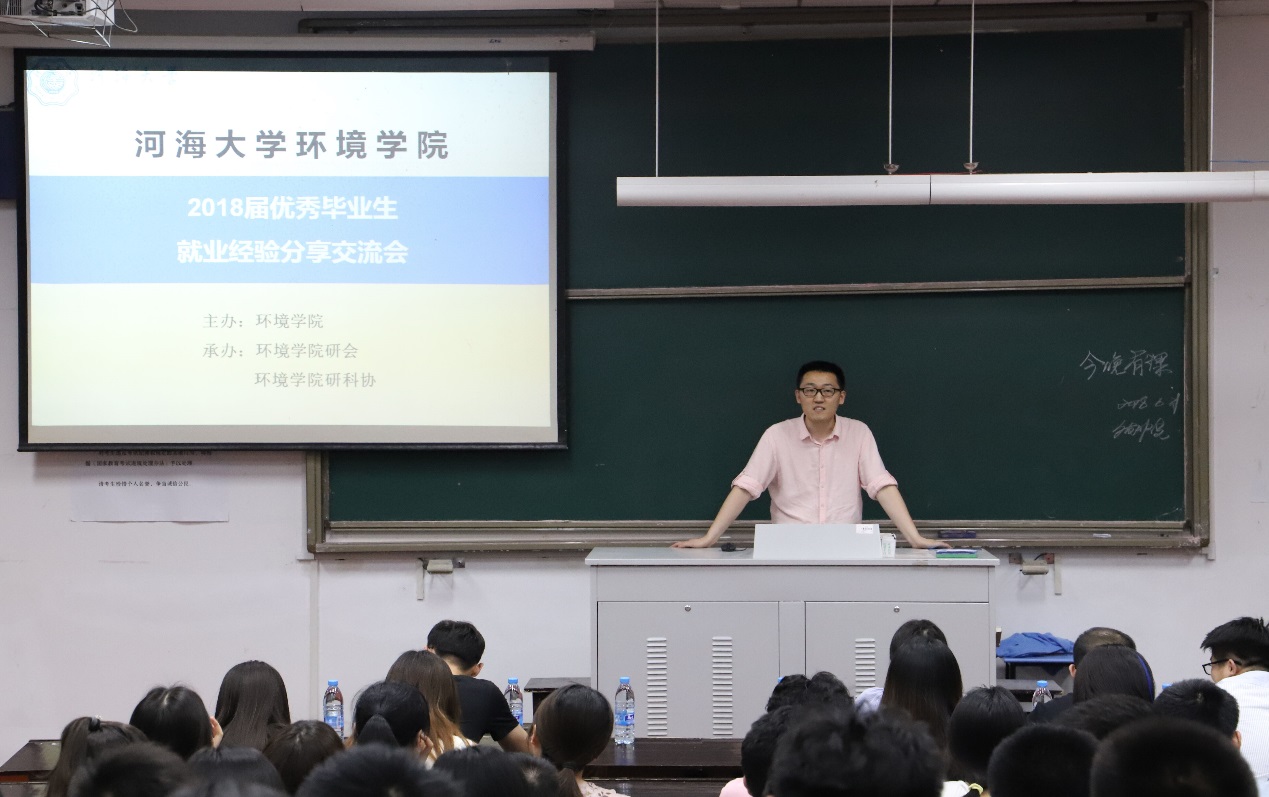 河海大学环境8x8x 2018届优秀毕业研究生就业经验分享交流会于6月21日晚6:30在水利馆B101成功召开。会上请到了七位2018届毕业研究生,他们分别是2016级环境工程专业的杨玺、邢明明,2015级环境科学与工程专业的朱晓晓、孙红伟、周睿,2015级市政工程专业周仕华和谭怡雯。