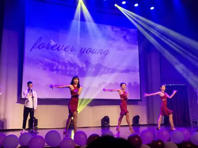 由吴璟涵、邓梦婷、李星雨、罗钧泽带来的歌舞表演《Forever young》,一出场便赢得阵阵掌声。罗钧泽同学深沉迷人的嗓音,三位女生优美的舞蹈加上有些醉人的灯光,让人不觉慢慢沉醉其中。突然灯光一闪,音乐一变,缓慢的音乐变换成动感的拉丁,场下不是传来阵阵欢呼声,女生们迷人的身姿在灯光下变换,引得大家纷纷挥舞手中的荧光棒,积极和他们互动。动感的音乐与舞蹈将现场的气氛推向高潮,台下的同学们不再像开始那样拘谨,开始积极和台上互动。