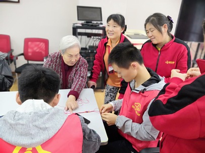 待老人全部入座,志愿者们也分别坐在了老人旁边,一边与老人交谈,一边编织手链。在编织手链的过程中,志愿者们聚精会神地听着老人们讲述以前的故事,不断向老人们询问故事细节,老人们的情绪也更加高涨,纷纷露出了怀念的笑容。