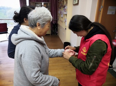 刚开始编手链时大家还有些生疏,但在与老人一起观看视频,共同分析步骤后,大家逐步把握了技巧。随着时间的推移,大家编织的手链也越来越好,编织的速度也越来越快。编好后,志愿者们纷纷为老人佩戴上亲手编织的手链。看到老人们开心的笑脸,大家都不禁感到此次活动十分有意义。