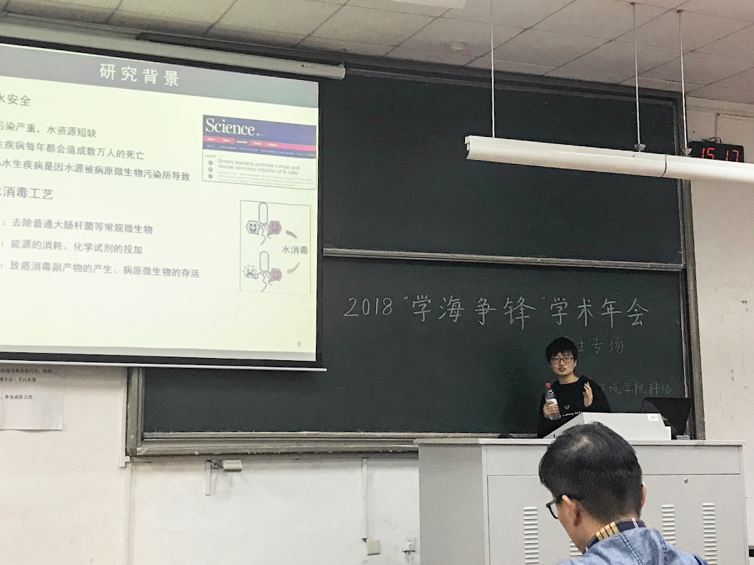 第二位上台的是张弛师姐,她的演讲题目是:石墨相氮化碳基光催化材料的制备以及其对水中病原微生物的灭活研究。师姐从饮用水安全和传统水消毒工艺方面阐述了传统工艺在水处理上的弊端,介绍了光催化技术在水处理中的潜力,以及石墨相氮化碳在水处理中的优势;然后又详细介绍了这种新材料的研发和其灭活饮用水中病原微生物的性能。