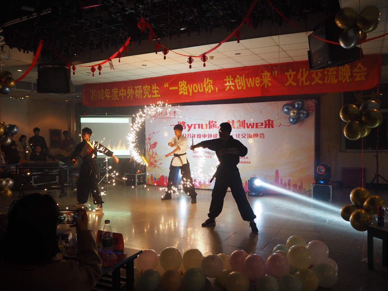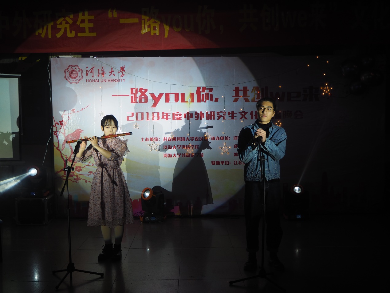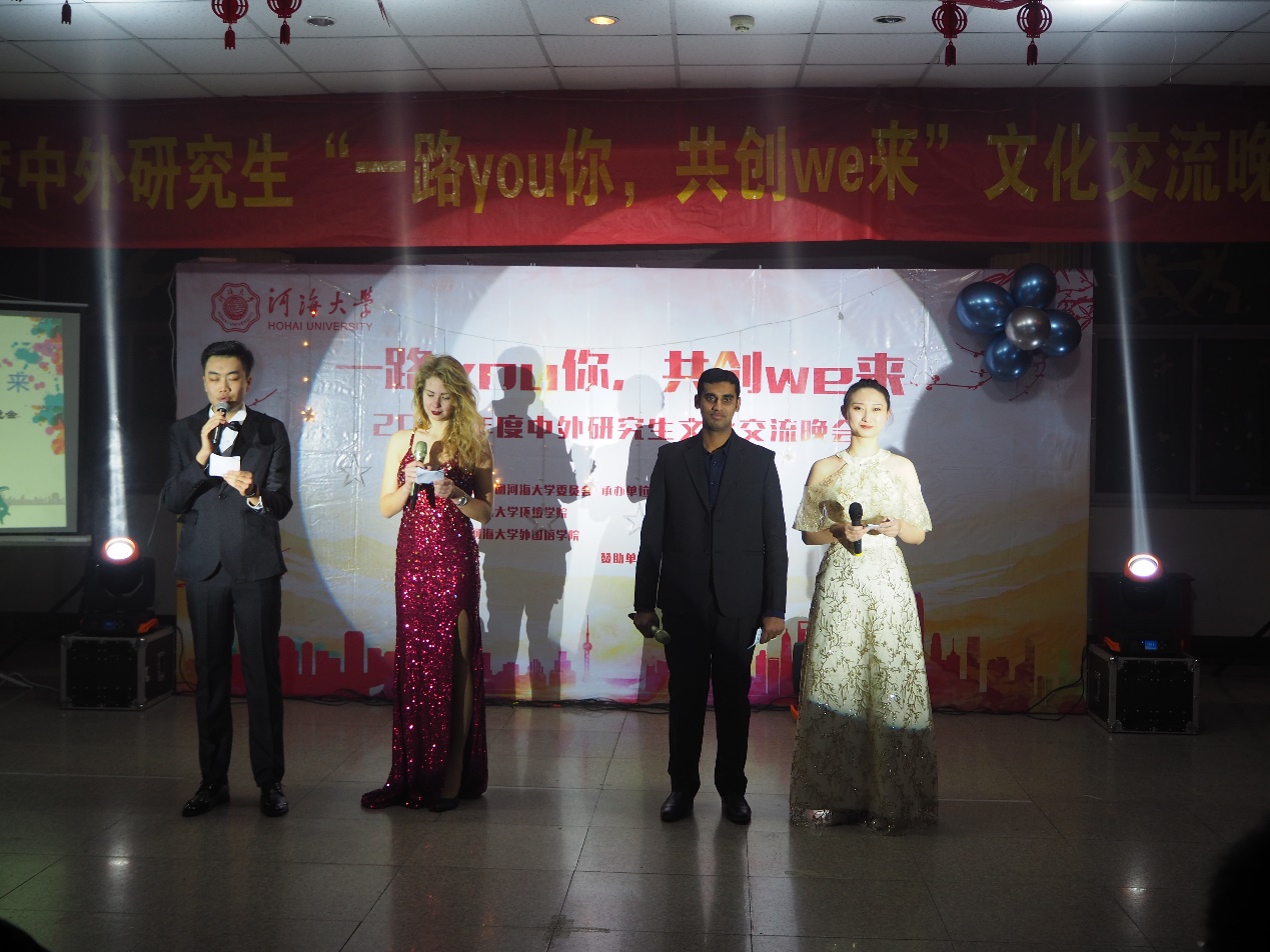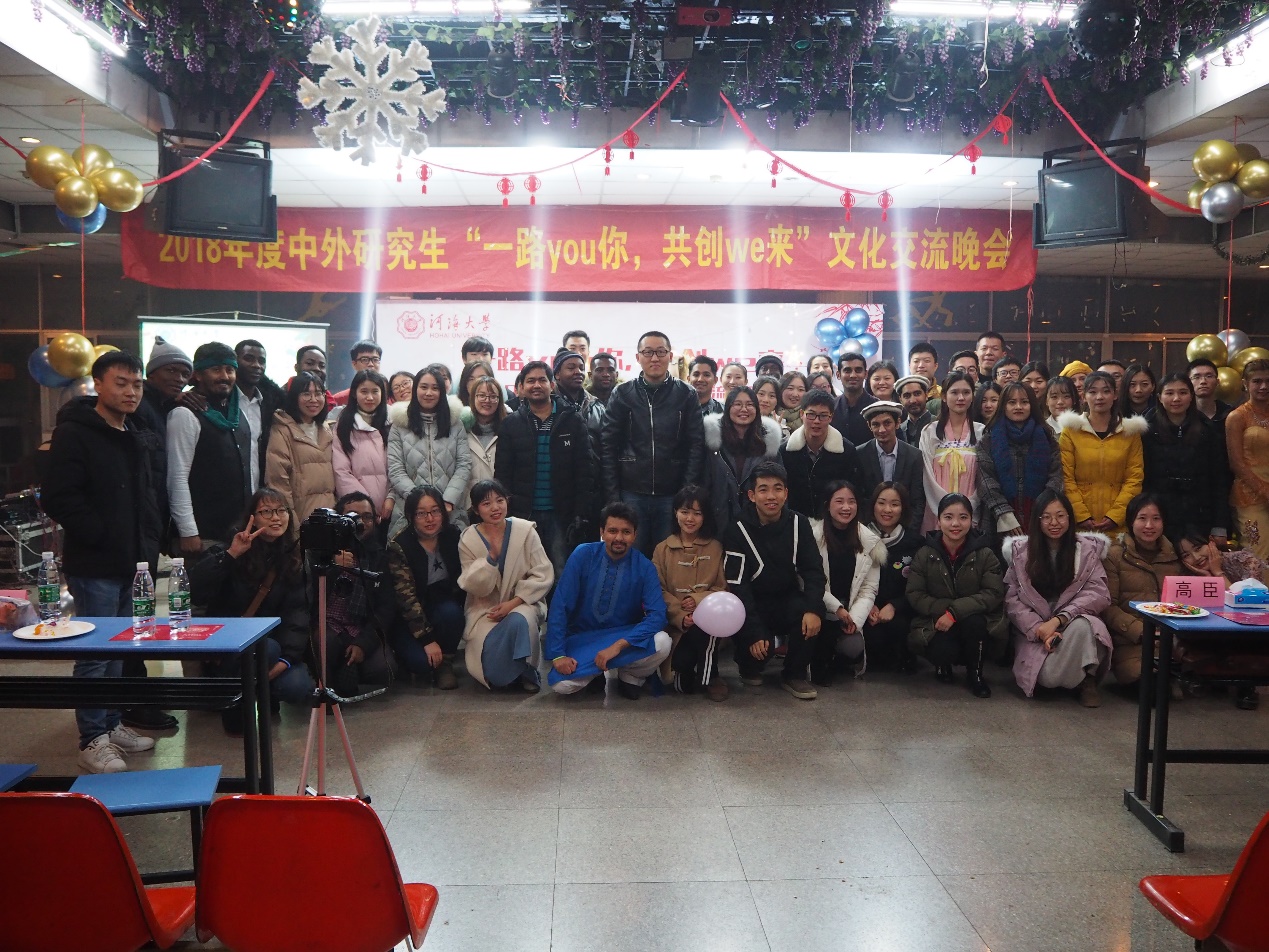 2018年12月8日晚18:30,在8x8x 鼓楼校区学生城举办了主题为“一路you你,共创we来”8x8x 中外研究生交流晚会。此次晚会由共青团8x8x 委员会、8x8x 、8x8x 外国语8x8x 主办,8x8x 研究生会、8x8x 研究生会及外国语8x8x 研究生会承办,旨在丰富同学们课余生活,加强不同国家间的文化交流,推动8x8x 文化活动的蓬勃发展,给各国同学们一个真正展示自我风采和文化交流的舞台。参加晚会的嘉宾有8x8x 研究生导员高臣老师和16级8x8x 主席团的师兄师姐,以及各8x8x 研究生会主席。
