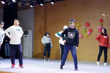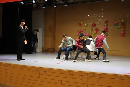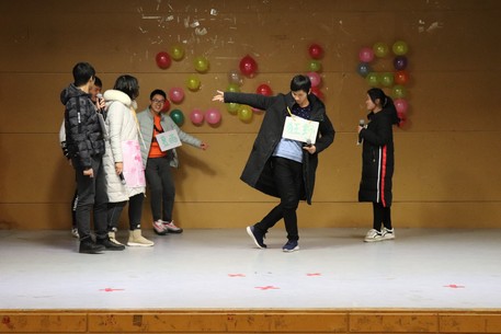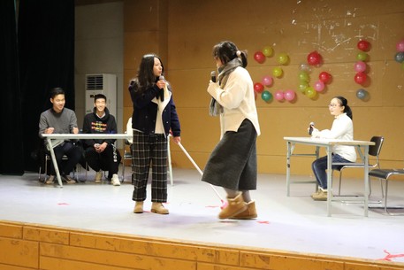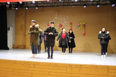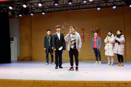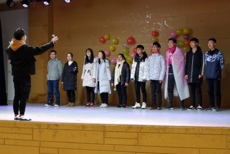 不知不觉欣赏了不少节目,现在又到了现场互动游戏时刻,在场内氛围的带动下,踊跃加入的同学更多了,连场下看节目的辅导员钮青也被同学们推上了场,加入到游戏中。有了辅导员的参与同学们更加激动,现场气氛再次到达高潮。