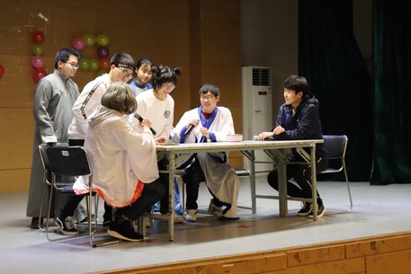 情景剧《社团纳新》是管培15组与30组准备的节目,由大学中的社团招新展开,体现着现代大学生多姿多彩的大学生活,也展现出力争上游的大学生形象,接连抖出的包袱引来场下同学们的阵阵欢笑。