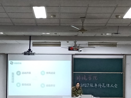 17级年度总结大会总由两部分组成。分为各班班长的汇报展示,和辅导员钮青老师对同学们一个学期的努力总结。