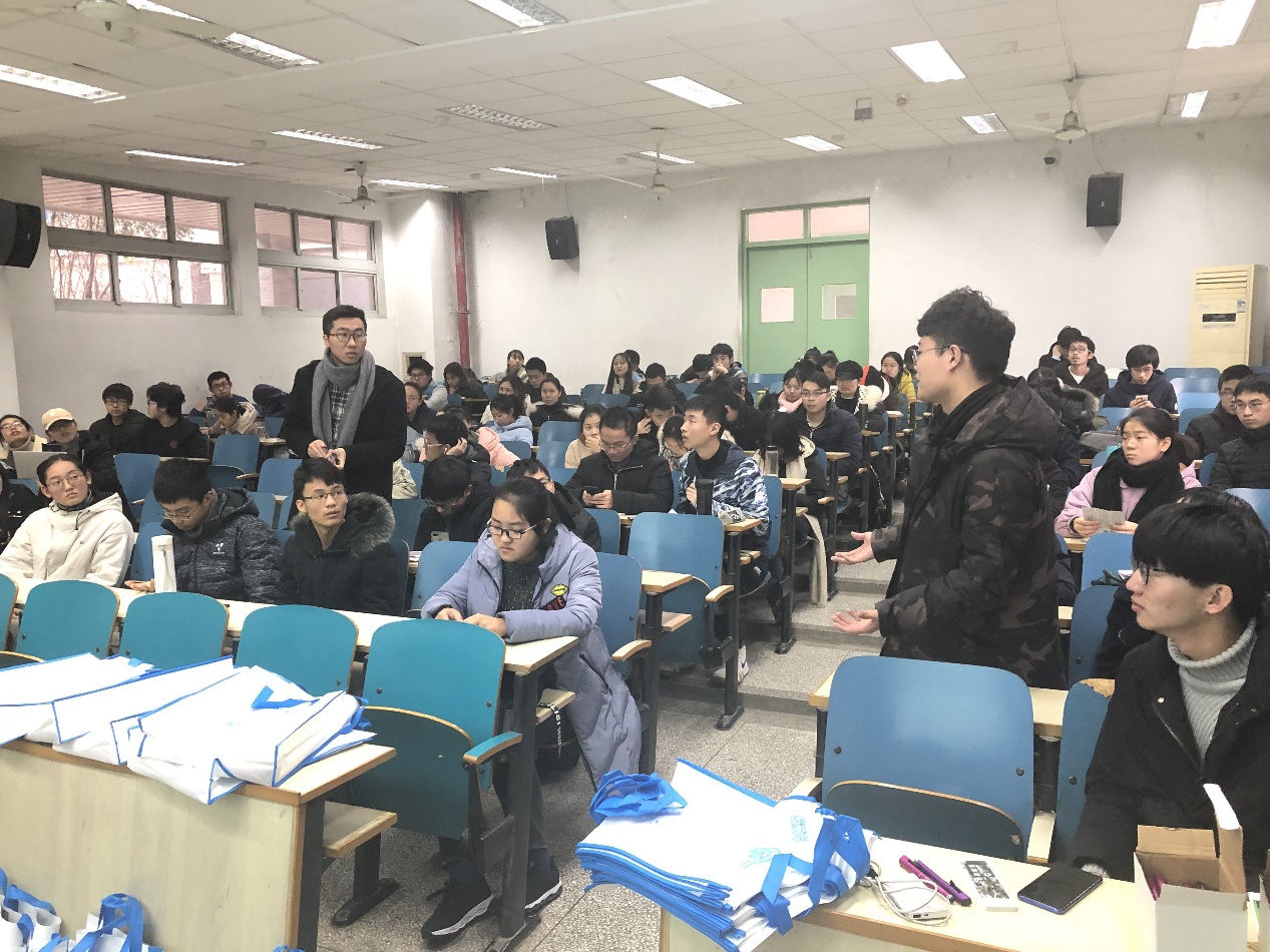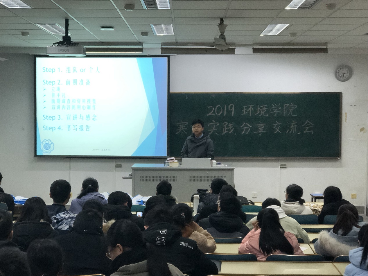王少伟和汪涵同学则是参与了在环境院立项的团队实践。他们首先介绍了如何在回母校宣讲前做好前期准备,以应对学弟学妹和家长们的各种问题。然后他们为我们分享了物资准备经验,例如除8x8x 提供的资料外还可以自己制作海报、书签和明信片等小礼物。此外,他们还分享了去年答辩时的PPT,并展示了优秀的申请书和策划书,让18级同学了解了如何去评选优秀实践团队。