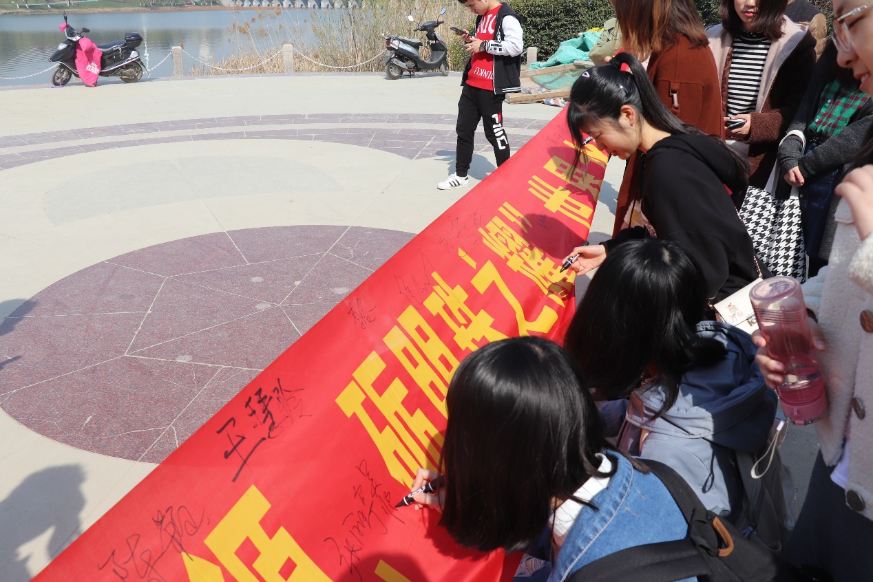 在近三个小时的调查后,志愿者们陆续返回了集合的地点。在负责人的组织下,每个人都在横幅上签下了自己的名字,标志着自己节约用水以及保护水资源的决心。
