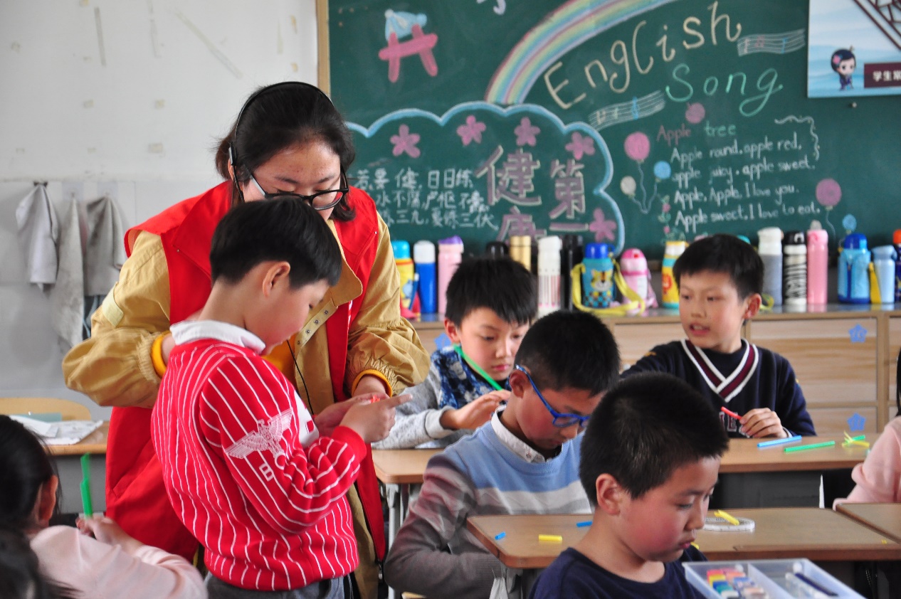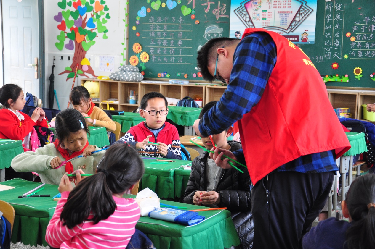 讲解和提问部分结束后,就是小朋友们最喜欢的动手环节。志愿者给小朋友们分发吸管、胶水等手工材料,随后播放教学视频,向大家演示如何制作出吸管花。教室里的气氛更加热烈,小朋友们全身心投入其中,而志愿者们则耐心地指导他们,帮助他们做出令自己满意的作品。
