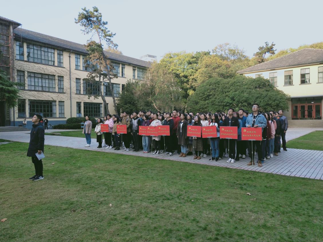 仪式第一项,升国旗,奏唱国歌,全体师生面向国旗行注目礼。此次升旗由本科生给排水党支部李雨笑和王澳两位同学担任升旗手。清晨的第一缕阳光投向五星红旗,晚秋的寒冷也扑不灭环境院学子的一腔爱国之情。“起来!不愿做奴隶的人们!”《义勇军进行曲》响起,那一抹中国红冉冉升起,全体师生庄严地注视着国旗,高唱国歌,表达对祖国崇高的敬意。