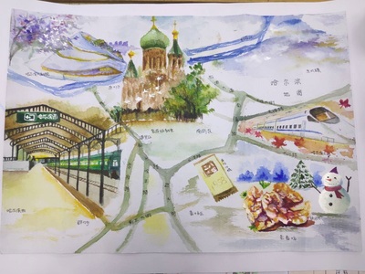 在整体布局方面,我将哈尔滨分为了东南西北中五个方位,又选取了不同地区的特色景点,这些景观都是哈尔滨的标志性建筑。体现了北国风光的独特魅力。同时,本幅作品还包含了哈尔滨的四个季节。哈尔滨是温带季风性气候,四季分明。这幅画通过对四个季节的细致描绘,展现了哈尔滨独特的四季之美。