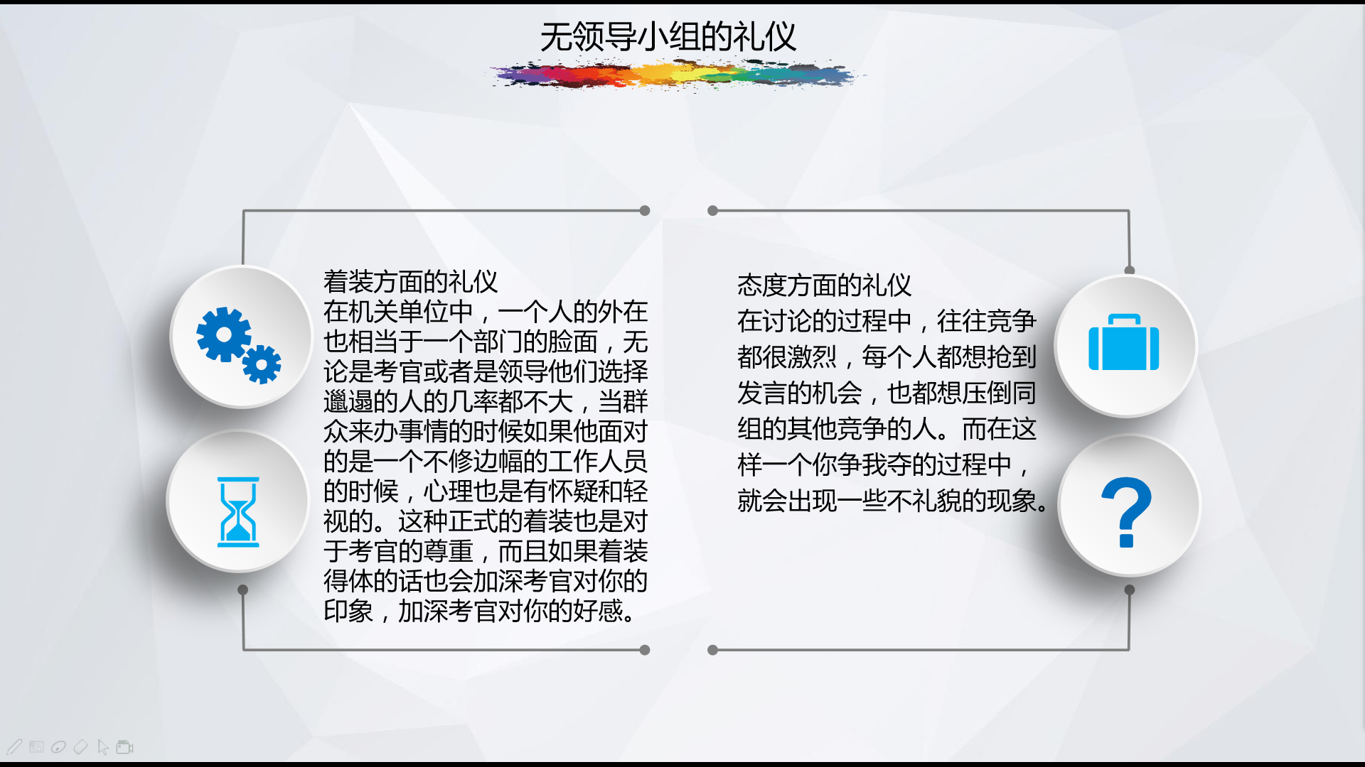 在活动正式开始之前,陈老师还为大家介绍了无领导小组的礼仪、分类、规则等,让同学们了解整个讨论的流程,以及需要注意的问题。