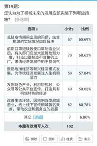 通过QQ空间和微信转发问卷,调研团从疫情关注度、生活便利度、群众满意度,经济恢复等获取人民的所思所感。桐城人民时刻关注疫情进展,坚决执行政府发布的防疫措施,人民对政府工作满意度很高。但也有部分群众透露存在没有及时控制人员返桐的问题,之后有关部门采取了更严格更频繁的人口调查登记,弥补了疫情前期出现的问题。疫情催生出的地摊经济在桐城开展的规模并不大,但据了解它确实带动了消费,群众对于经济的恢复也很有信心。但是桐城地区偏僻消息闭塞固守技术含量低经济收益慢的传统产业比如塑料而不肯创新,调研团认为桐城应吸取地摊经济的经验接触新事物,调整产业结构借助媒体宣传桐城特色提高知名度带动相关产业的发展。