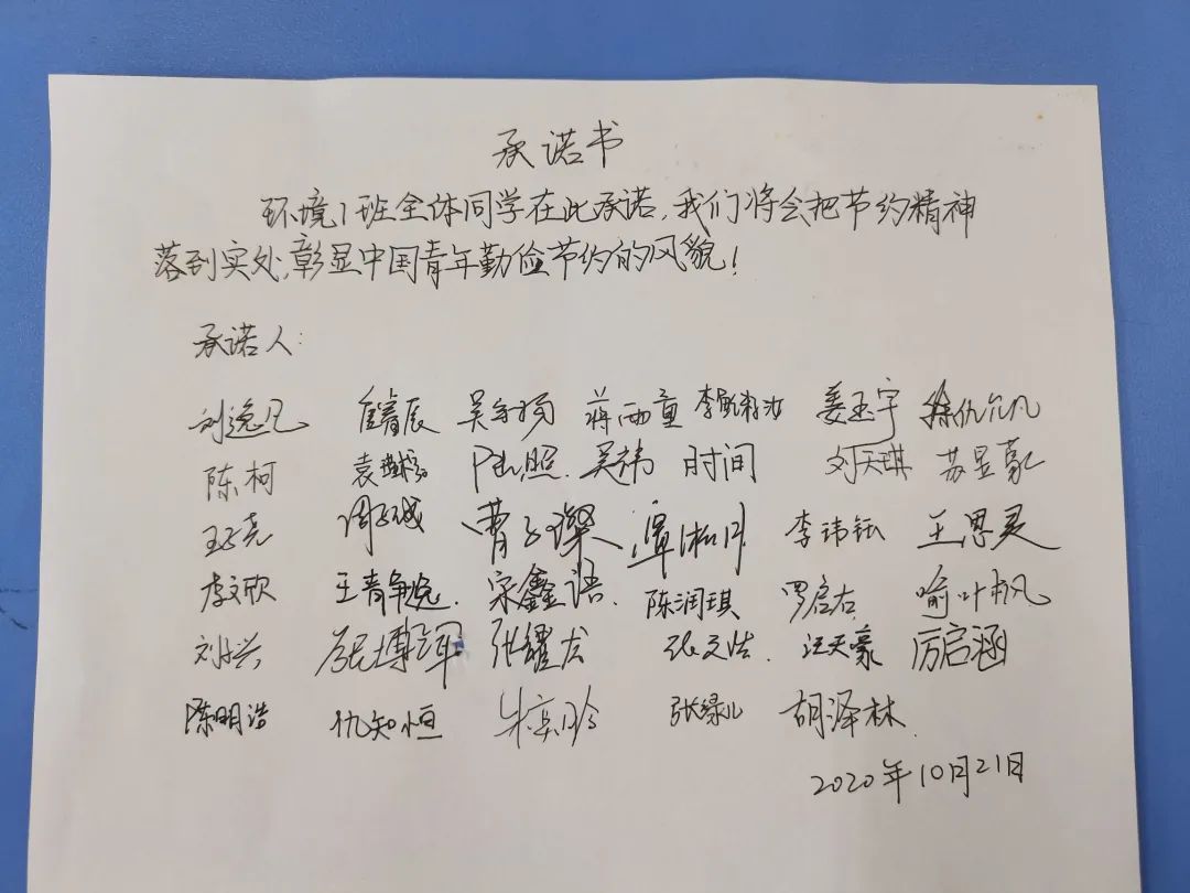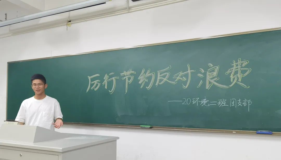 2020年10月21日,2020级环境一班在致高楼B404举办了“厉行节俭”班会。团支书倡导同学们践行光盘行动,不剩饭剩菜,以“光盘”为荣,“剩宴”为耻。同学们积极发表自己的看法,并以情景剧的形式展现了浪费的不良行为。本次班会进一步加强了同学们的勤俭节约意识,培养了厉行节俭的优良品格。最后同学们签署承诺书,并且分享了自己光盘行动的照片。