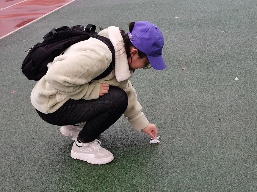 但在东操场的观众席上,密密麻麻地、认认真真地,是环工二班的同学们正在擦拭着满是尘土与水痕座椅的身影。再转睛一看,操场上有不少身影,站起、蹲下、站起、又蹲下,仿佛一只只蚂蚁,匍匐着,虔诚着,对大地进行信徒的朝圣。