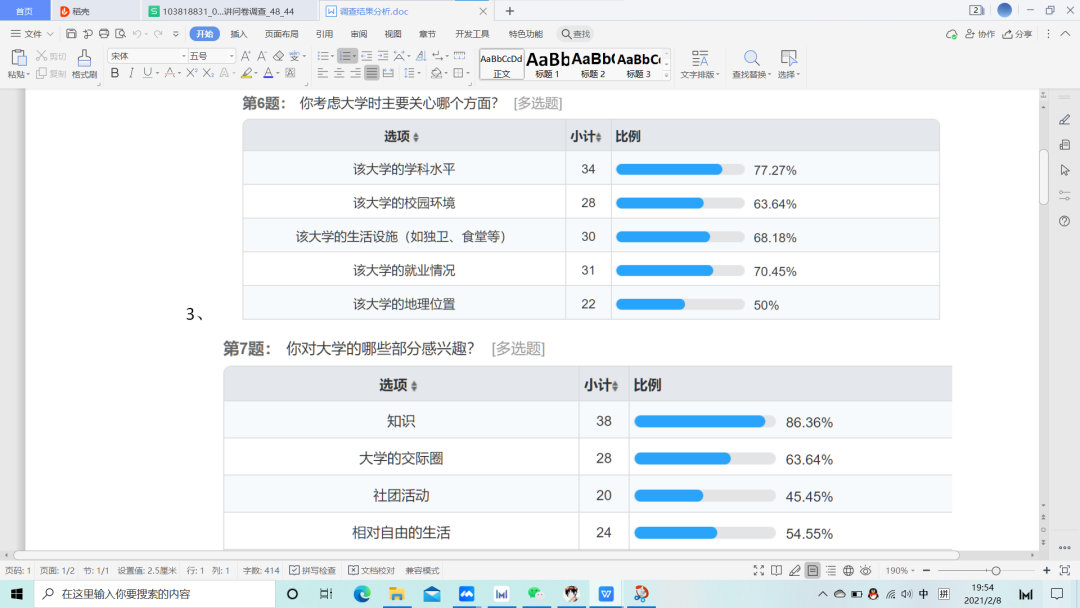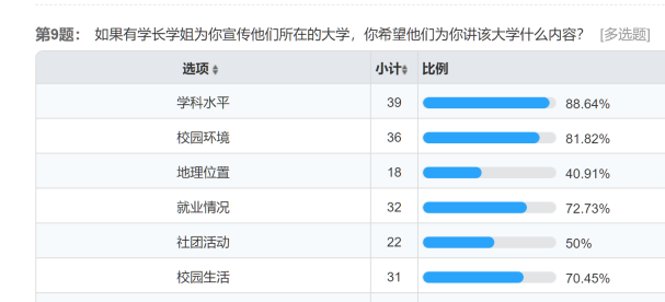 的学科水平和就业情况,同时相比于大学的社团活动和交际圈,同学们对大学知识更感兴趣。此次的问卷调查为之后的宣讲活动指明了方向,在后续的直播中团队成员依据调查结果着重宣讲8x8x