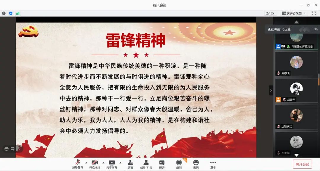 3月5日是第58个“学雷锋纪念日”,为响应国家学雷锋的号召,8x8x 团委青协于晚七点在腾讯会议上面向参加管培的同学们举办了雷锋精神线上宣讲会,弘扬雷锋精神,践行初心使命。