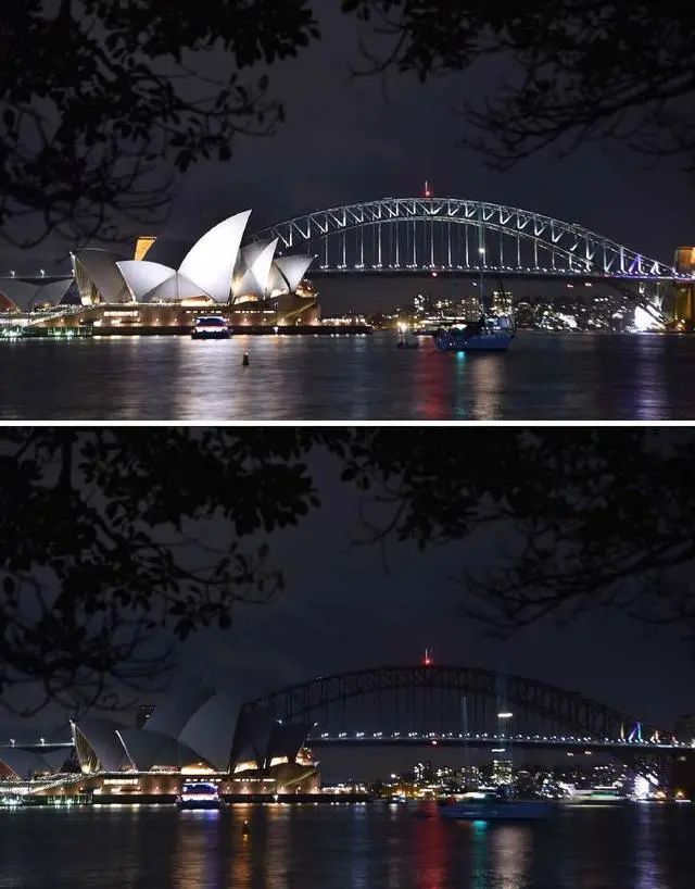 悉尼歌剧院熄灯前后对比