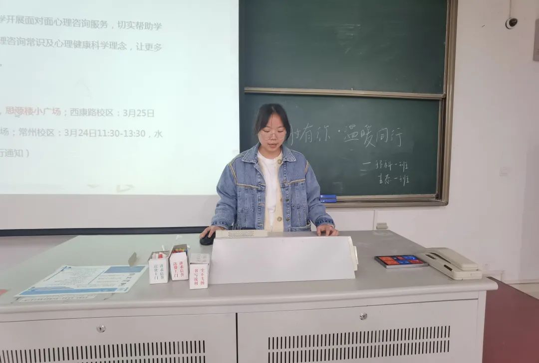 最后,向同学们介绍校内心理咨询相关的详细资料,鼓励同学们必要时寻求专业的心理疏导与帮助;宣传近期心理相关活动安排,鼓励感兴趣的同学们积极参与。同学们一起深入了解内心,更充分的认清自我,为未来而努力奋斗,一起健康快乐地生活。