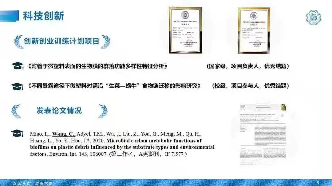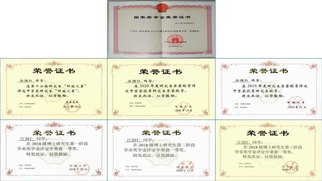 他用笃学筑为学之本,在实践中明知行合一。读博期间以第一作者身份发表A类期刊SCI论文8篇,总影响因子达59.327,其中3篇论文入选“ESI高被引论文”,1篇论文入选“ESI热点论文”。申请国家发明专利9项,其中已授权国家发明专利3项。他学业优秀,连续三年获得8x8x 一等学业奖学金,2019年博士研究生国家奖学金。荣获8x8x “2020年度优秀研究生”;8x8x 第十二届研究生“科技之星”;8x8x “2019年度优秀研究生”等荣誉称号。他勇于承担,求真务实,博士期间主持了江苏省研究生科研与实践创新计划项目、8x8x 优秀博士生培育计划、8x8x 优秀博士培育计划。