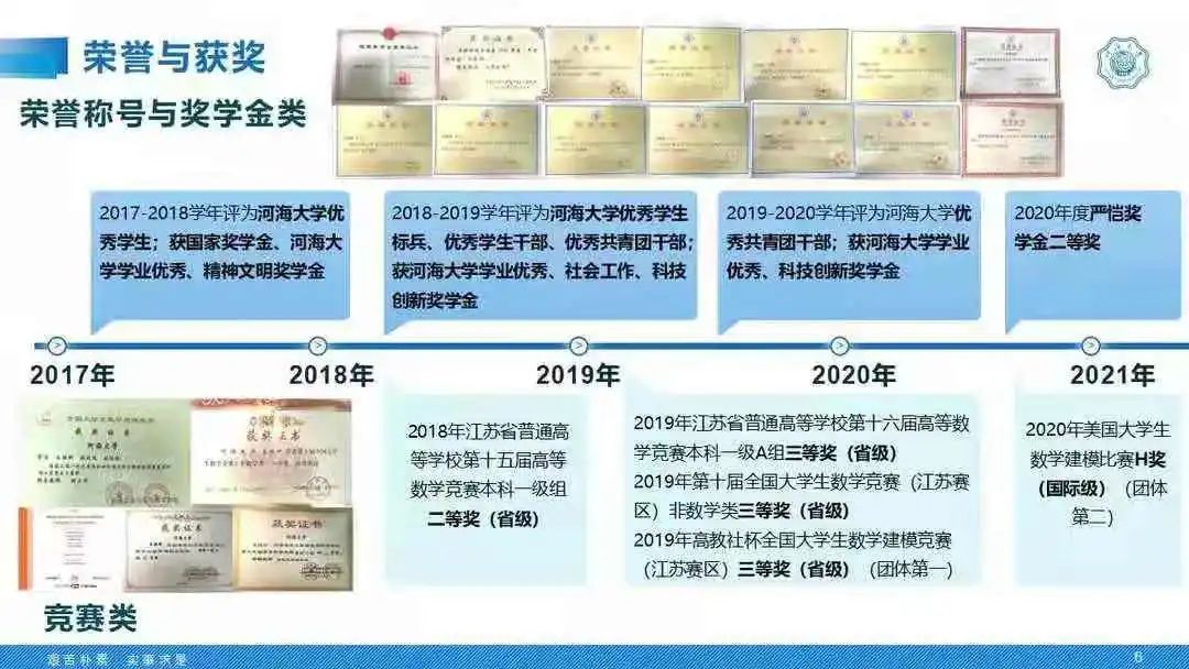 目标明确,严于律己,绩点4.85,排名专业第一。曾获严恺奖学金、国家奖学金等9项奖学金;8x8x 优秀学生标兵、优秀共青团干部等5项荣誉称号。她积极参加科研活动,以第二作者发表一区SCI论文1篇(导师一作),第四作者发表1区SCI论文1篇,负责国家级大学生创新训练项目一项并以优秀结题。在学科竞赛上,她积极参加大学生数学竞赛和数学建模竞赛,数理知识扎实,曾获江苏省普通高等8x8x 第十五届高等数学竞赛本科一级组二等奖,2019年高教社杯全国大学生数学建模竞赛本科组江苏赛区三等奖等5项奖项。曾任8x8x 青年志愿者协会部长,现任2017级生态一班团支书。