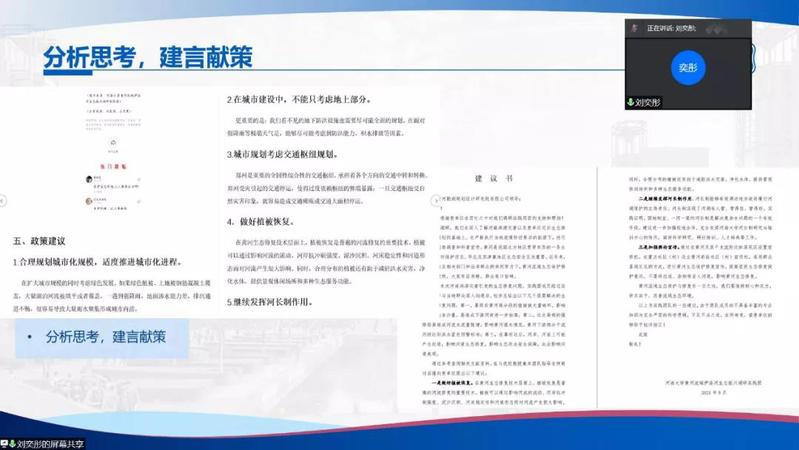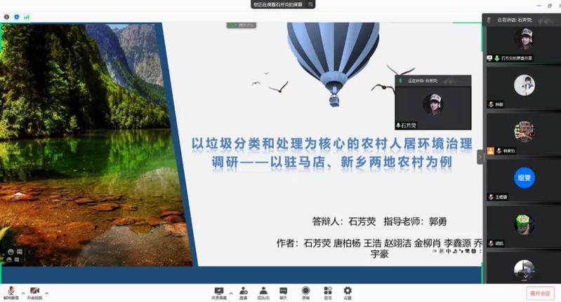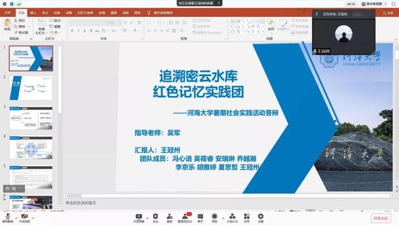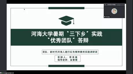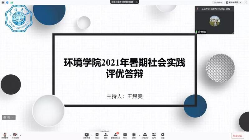 为推进落实8x8x 暑期“三下乡”社会实践活动总结工作,2021年9月15日下午,8x8x 举行了2021年暑期实践线上评优答辩。市政工程系胡凯老师,环境工程系王大伟老师,院团委书记兼20级辅导员金意倩老师、20级辅导员杨铮老师担任评委。疫情的特殊情况给今年的社会实践团带来了机遇和挑战。虽然大部分团队的队员都居住在不同的地方,给线下活动带来了不便,但是实践团使用了线上会议、网上问卷、就近走访等多种途径解决问题,并且顺利地完成了实践活动。线上答辩由团队借助PPT形式进行实践总结以及评委提问两个环节组成。主持人王煜雯同学简要地介绍了此次答辩的背景和评选标准后,答辩正式开始。