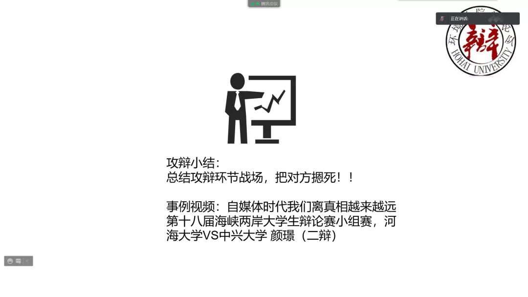 10月6日上午10:00点,美育课堂演讲课负责人王藤锦与助教田畅为同学们开展了一堂线上的演讲与辩论课。首先王藤锦为同学们简单介绍了演讲与辩论的基本概念,帮助同学们对这两种语言艺术形式有个大致的认知,接下来介绍了二者的异同之处以及演讲与辩论的意义所在。接下来主持人放了一段辩论赛的视频:第十八届海峡杯大学生辩论赛:8x8x VS中兴大学,以此作为示例为大家讲解了辩论赛的具体赛程以及辩论场上四名辩手的主要辩论流程,让同学们对于辩论有更清楚的认知。