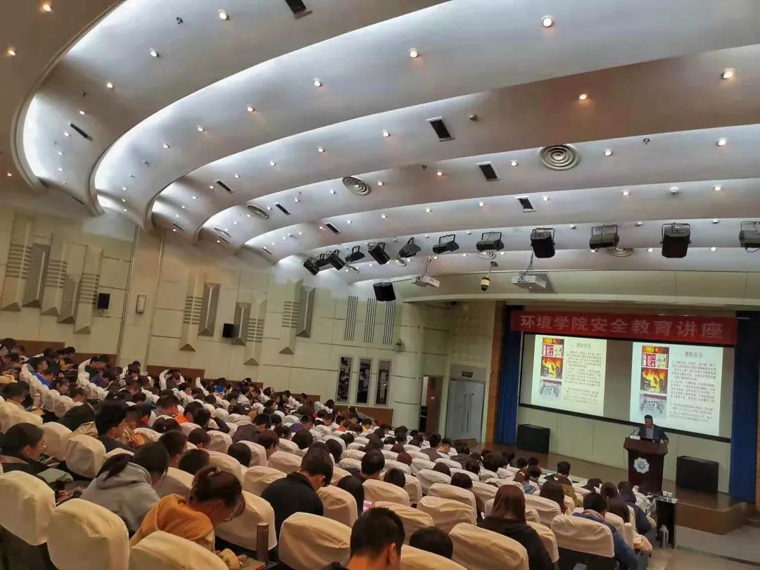 谈及心理安全,吴处长将真挚的目光投向在座的同学,将心理安全的重要性娓娓叙来。通过吴处长所举的例子,环境学子看到了阳光成长的重要性。吴处长在关于消防安全的讲述上,逐一指出了宿舍安全隐患与实验室安全隐患。如宿舍充电宝隐患、高功率电器隐患与实验室危险物品安全隐患。吴处长以简洁幽默的语言讲述了灭火器的使用方法与消防门的重要性,教育环境青年们:“安全工作没有终点”,并希望同学们做到“安全学习一起抓”的意识。而后,吴处长针对诈骗,列举了多个同学们身边出现的诈骗案例,提出如今诈骗的“精,真,狠”的特点,并向同学们提供了防诈法宝“十个凡是”打油诗,呼吁同学们积极反诈,提高反诈安全意识。