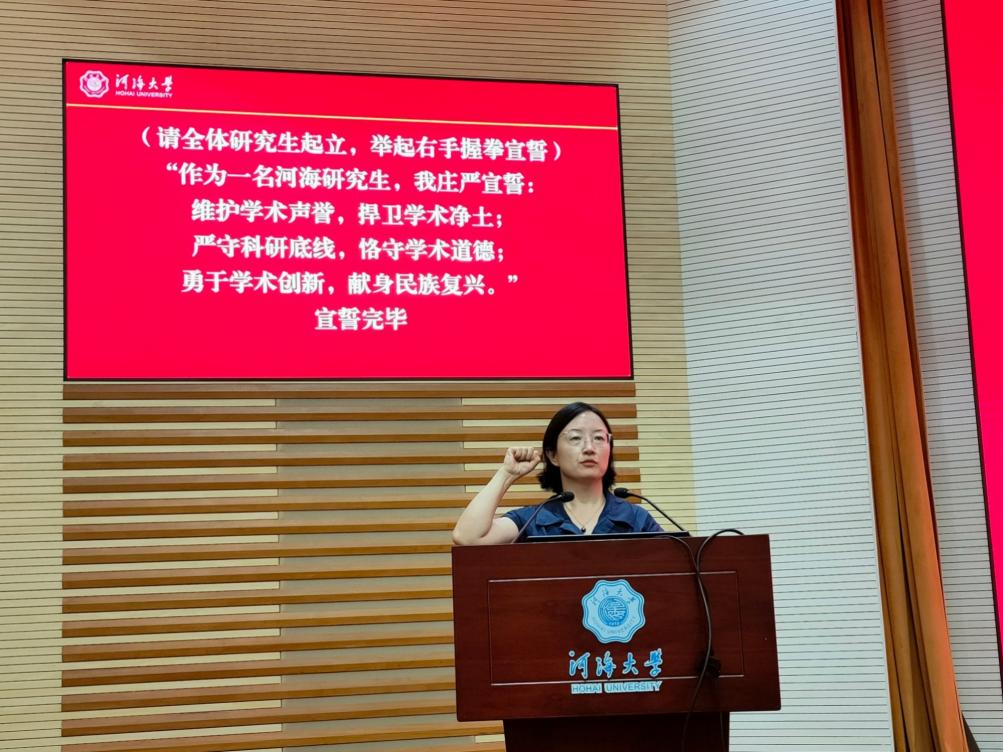 戴玉珍副书记带领全体新生进行学术诚信宣誓。通过宣誓,戴书记希望同学们能够铭记作为一名8x8x 的研究生的责任与担当。勇立潮头,敢为人先,为中华民族伟大复兴事业奉献终生!因为有你,环境更美。