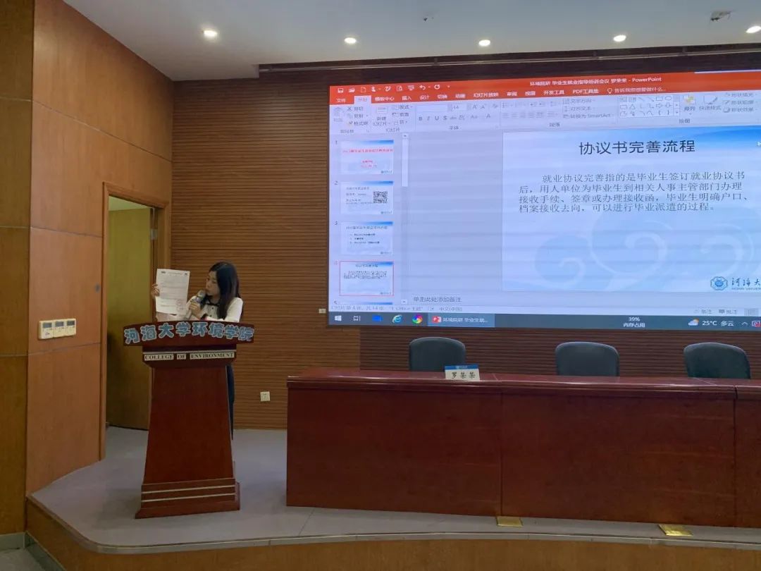 辅导员罗荣荣老师为同学们进行毕业生就业培训。她详细讲述了就业协议书完善流程、派遣程序以及毕业生户口、档案的托管。随后,对近三年研究生就业情况进行了展示。通过图表和文字相结合的方式,形象地向毕业生们讲述了近三年8x8x 的就业率、就业结构以及就业现状。通过对近三年研究生就业情况的了解,毕业生们更好地了解了当下的就业环境与择业方向。