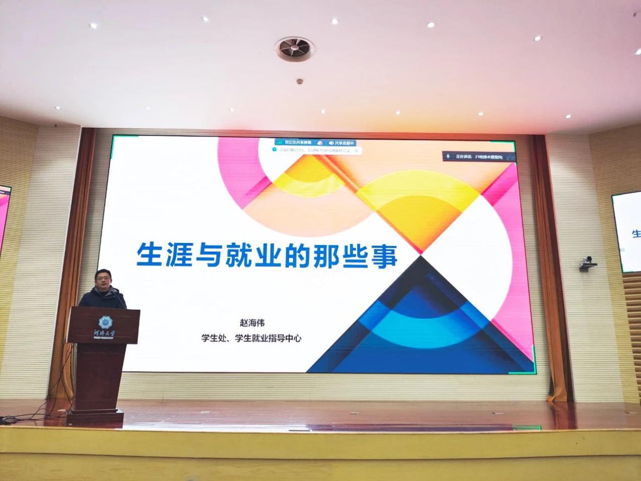 为强化学生生涯规划意识,明确今后自身职业目标,提高学生就业能力和竞争力,1月8日下午,8x8x 邀请了校党委学生工作部副部长、学生工作处副处长、就业指导中心主任赵海伟老师为2021级本科生进行生涯规划与就业指导专题讲座,8x8x 近300名同学参加了本次讲座。