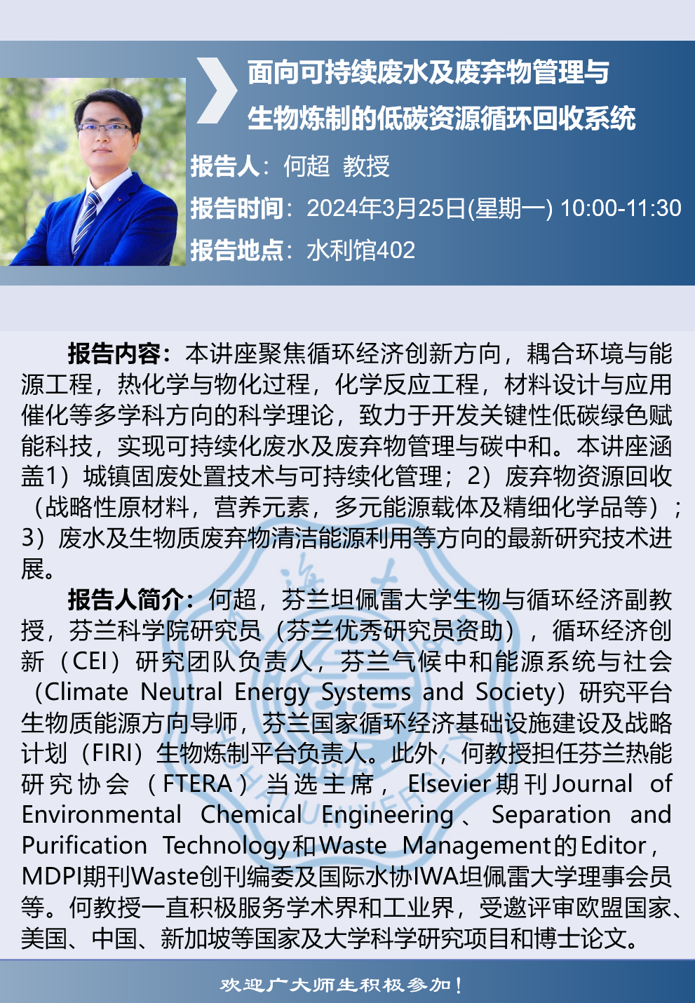 两山讲堂学术报告:面向可持续废水及废弃物管理与生物炼制的低碳资源循环回收系统