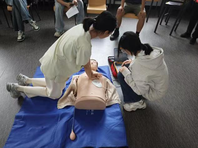 理论学习后,进入实操环节。同学们热情高涨,纷纷主动参与实践。在心肺复苏按压和AED使用操作中,大家轮流上阵,按照老师讲解的步骤进行练习。过程中,校医院老师全程耐心指导,手把手纠正同学们的动作,从按压的力度、频率,到AED操作的细节,不放过任何一个要点。同学们认真学习,反复练习,力求每个动作都精准到位。