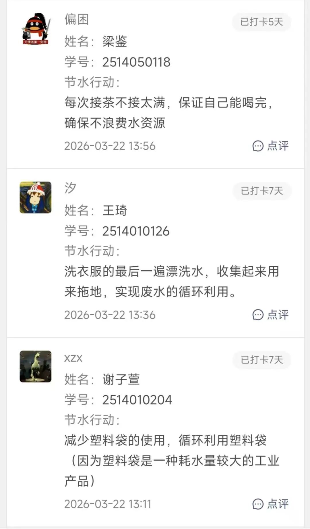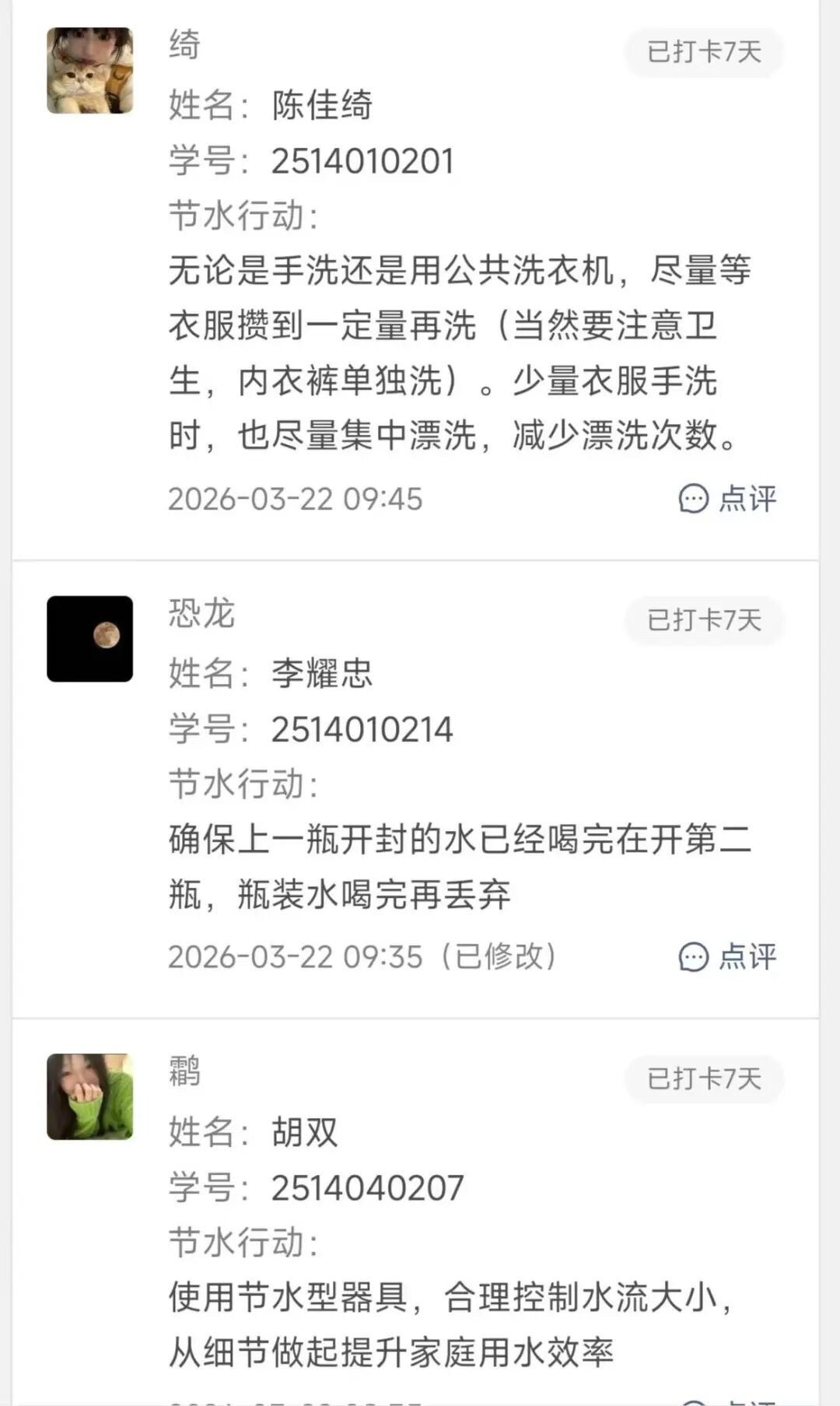 活动自启动以来,吸引了同学们的广泛关注与积极参与。大家通过线上平台,每日记录分享自己的节水行动与心得。从拧紧滴水的水龙头、喝完矿泉水瓶里的水,到缩短淋浴时间、用洗衣水冲厕所……一个个看似微小的“水滴印记”,汇聚成一幅同学共同参与节水的生动画卷。